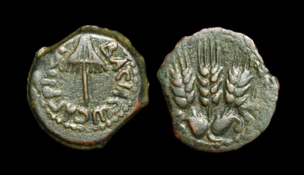 It's the only one I have but I like it! It's Herod Agrippa I, AD AE Prutah I believe or King Agrippa. Obverse is an umbrella like canopy with fringes. The reverse has 3 heads of barley. I believe it's year 6. I got this from the Sallent collection a few years ago.