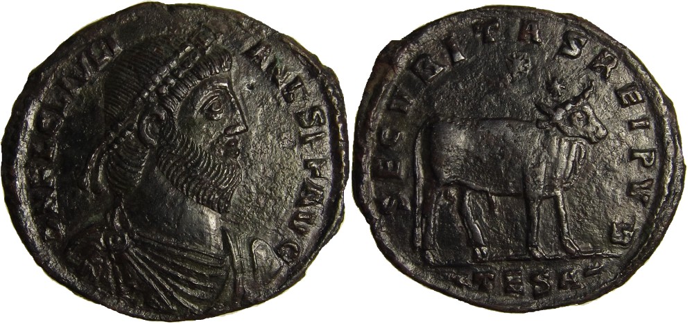 Welcome @montanvs ! Here are mine: Julian II, AD 355-363 Æ28, 7.4g, 6h; Arles mint, AD 360-363 Obv.: DN FL CL IVLIANVS PF AVG; Diademed, draped, cuirassed bust right. Rev.: SECVRITAS REIPVB; Bull standing right, two stars above, eagle to right, standing right on wreath, holding another wreath in its beak In Ex.: SCONST Julian II, AD 360-363 AE3, 21mm, 2.6g, 12h; Heraclea mint: 361-363 Obv.: D N FL CL IVLIANVS P F AVG; helmeted, cuirassed bust left holding spear and shield. Rev.: VOT / X / MVLT / XX - Legend within wreath HERACLA