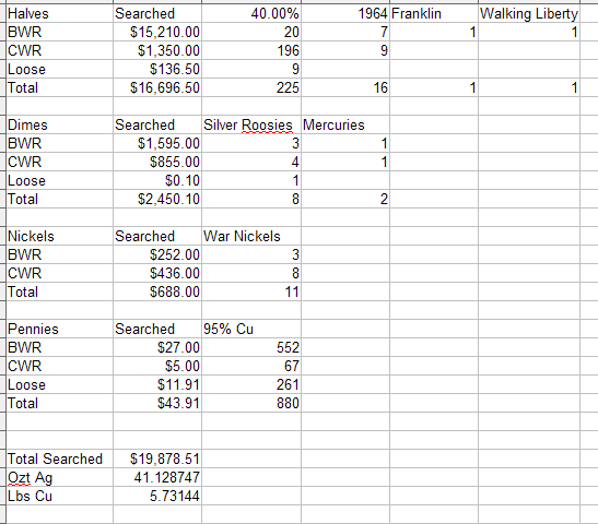 Total of 17.53oz from $24,190 searched, or $1,379 searched per oz. If we take out the nickels, it drops to $1,329/oz.