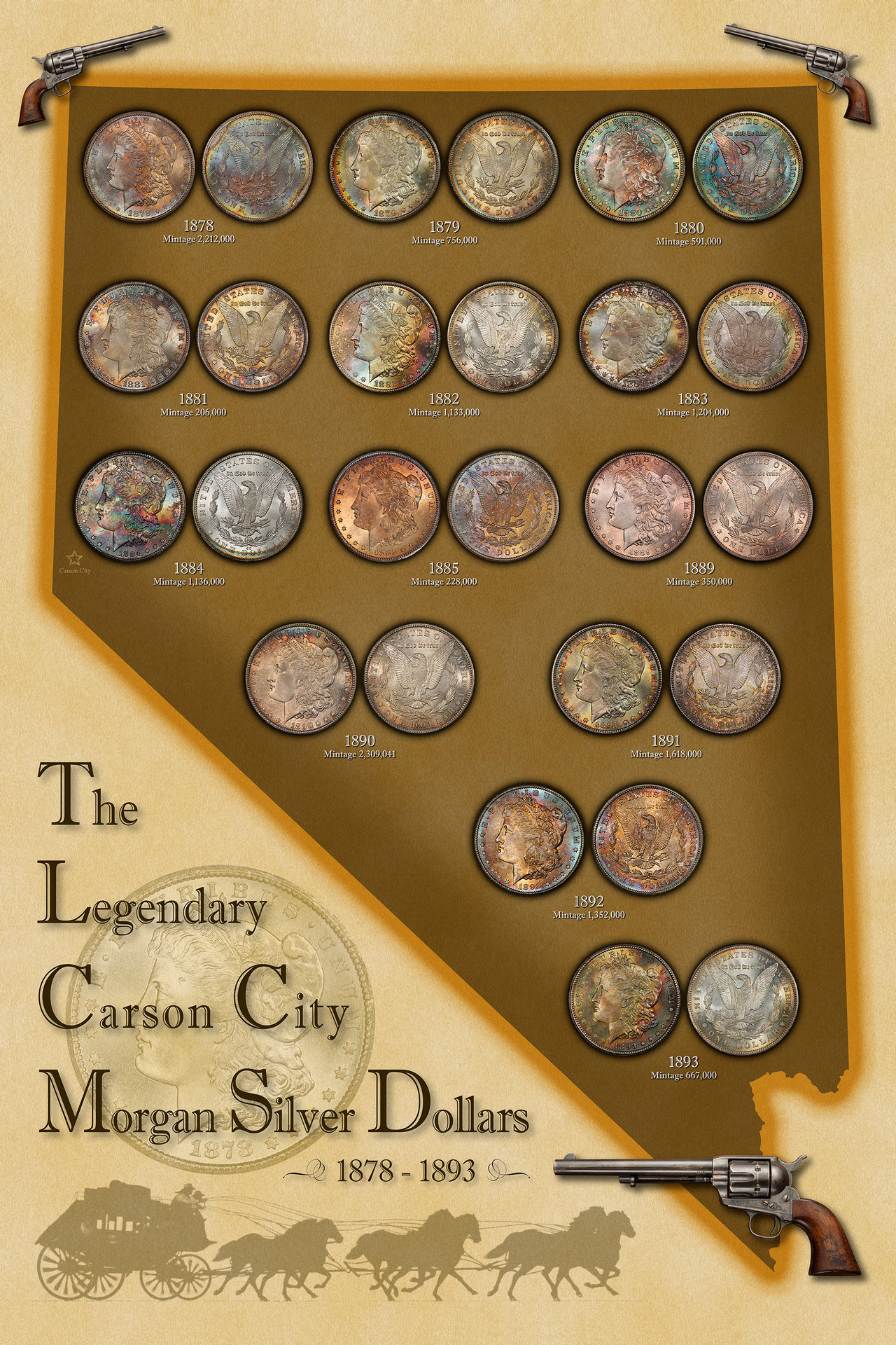 I've been wanting to hang a coin related poster on my wall for a long time now. So after thinking of something fun to do, I decided that a toned Carson City Morgan Set would look really good and I could keep the coin sizes decent enough that they could be seen from a few feet away. Unfortunately, I have not been lucky enough to have had the pleasure to photograph all of the CC coins, let alone toned. So, since this is a personal use project and I am not selling the poster or using the images for any commercial gain, I made use of some fantastic images from PCGS CoinFacts. Thankfully PCGS is very generous in allowing the public to download high resolution images for personal use. I decided on a final size of 24x36 for this poster. I went through and chose toned coins that would look good together. My personal preference for toned coins is not the wild neon rainbow, but a little different. If you've seen a lot of my toned Morgan Dollars that I post, then you have an idea of what my taste is. I've used the obverse and Reverse of each date. I did only one example for each year and excluded the major varieties to keep it simple. I was able to show the coins at double actual size, so each coin in the final print will be 3 inches in diameter. I went with a bit of a Western theme since these coins were minted in the pinnacle of the "Wild West" days. This was done using Adobe Photoshop and Illustrator. The image below is around 1/6th the actual size, but you can get an idea of the detail available. I hope you enjoy seeing it as much as I enjoyed putting it together. I would appreciate any feedback or comments you have.
