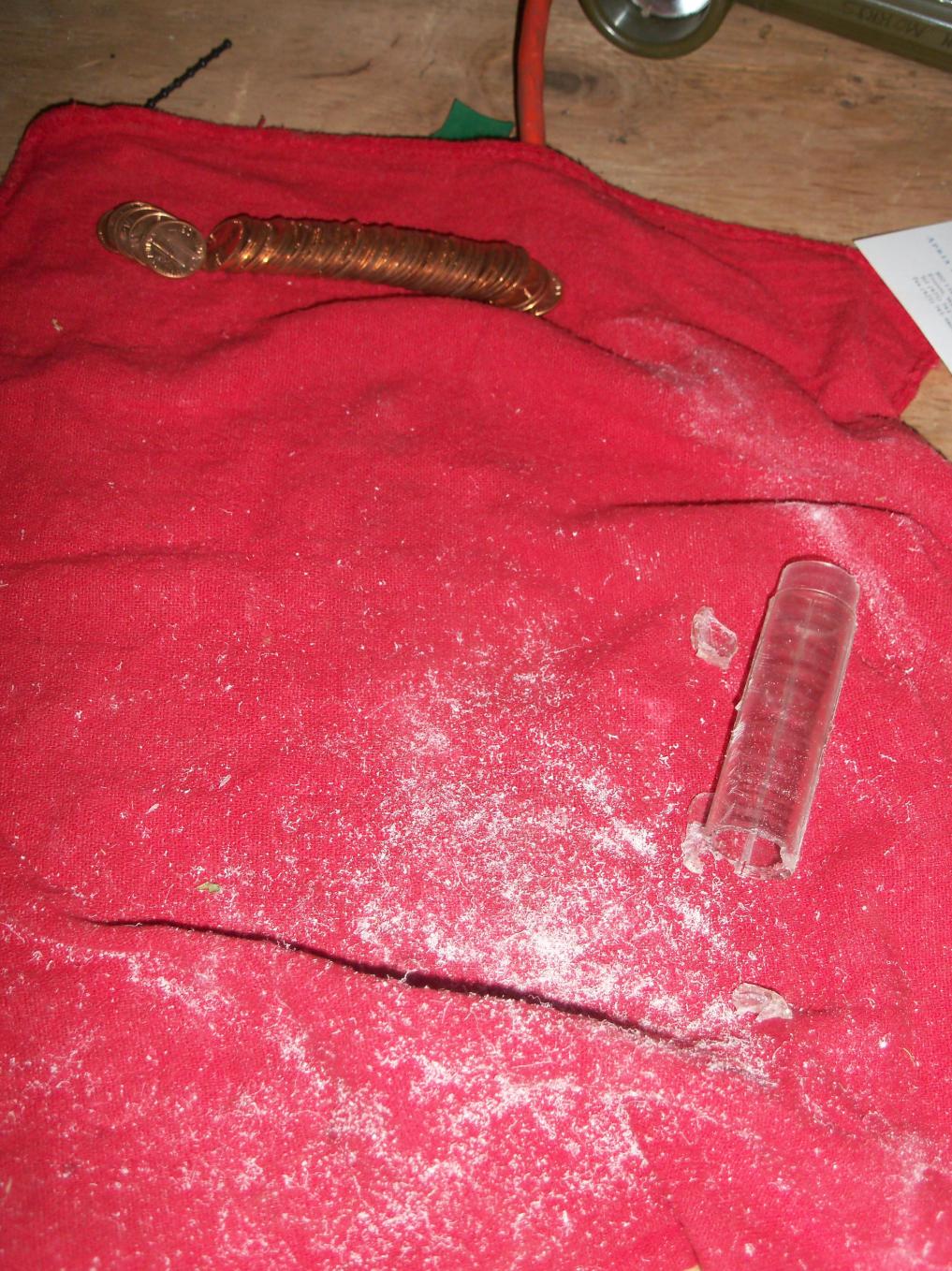 So I recently got a whole roll of UNC 1960-D Large date cents for the price of $1. I usually take two of the best and one goes in the folder and one goes in a 2x2. But this darned roll would not come out of the tube. I tried dropping it on the ground like all of my other broken tubes happened, and nothing happened. I try thumping the open end on the ground; not a budge. I eventually took a lighter to try to expand the plastic only burning my fingers. Time to call dad for help. We take the bottom end off and start using a hammer and punch to try to get one to push all the way through. NO DARNED PROGRESS! Next was a hacksaw. We sawed the plastic tube into halves making two incisions, didn't touch the coins, pried it apart with a screw driver, and used that pesky punch again. Success. Want some pics? Too bad. You get to see the whole shibang. Oh, and that one cent we punched? It could possibly have been the best one in the roll before we got to it.