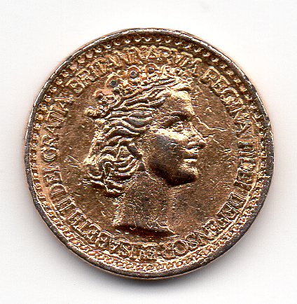 Ok my request for info on the Chinese 10 cash coins was a bust. So now that I've got your attention, I would like to point you all into a new direction of coins/tokens that I came across the other day. This joker looks fake. One side is completely pitted and the other has a glittery look. Similar to the concrete etching I do at work. So is it a cast contemporary or modern fake? Next up! What the heck is this? The image does not look like QEII.