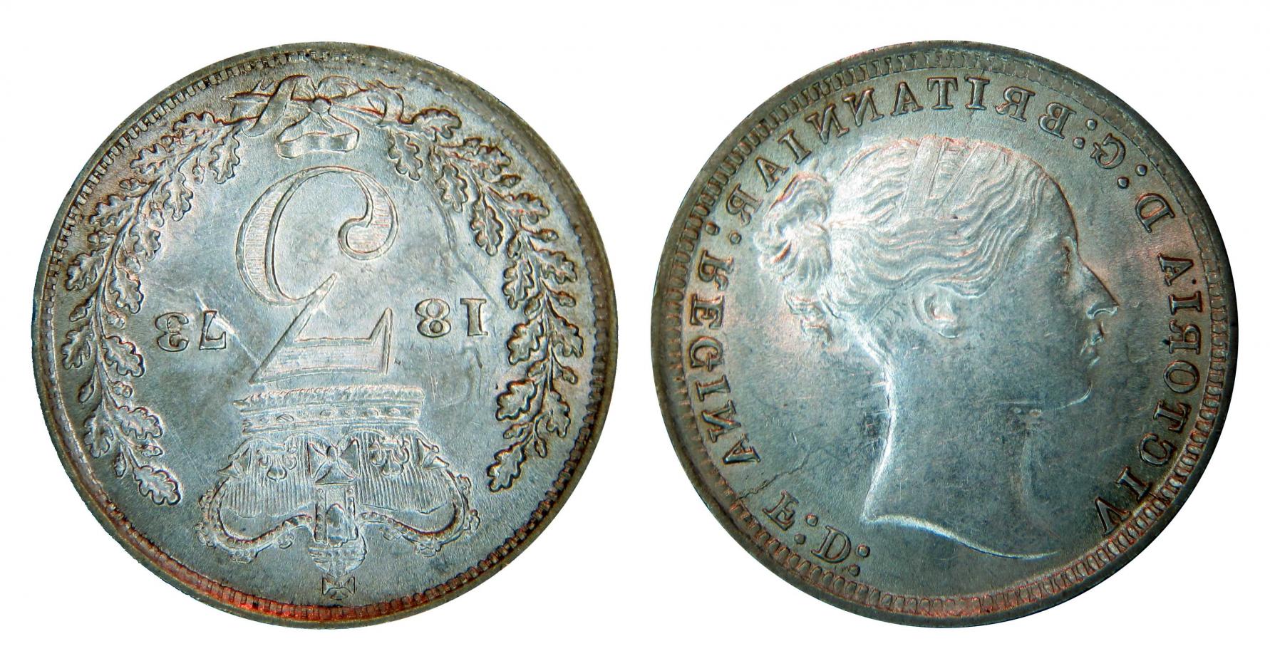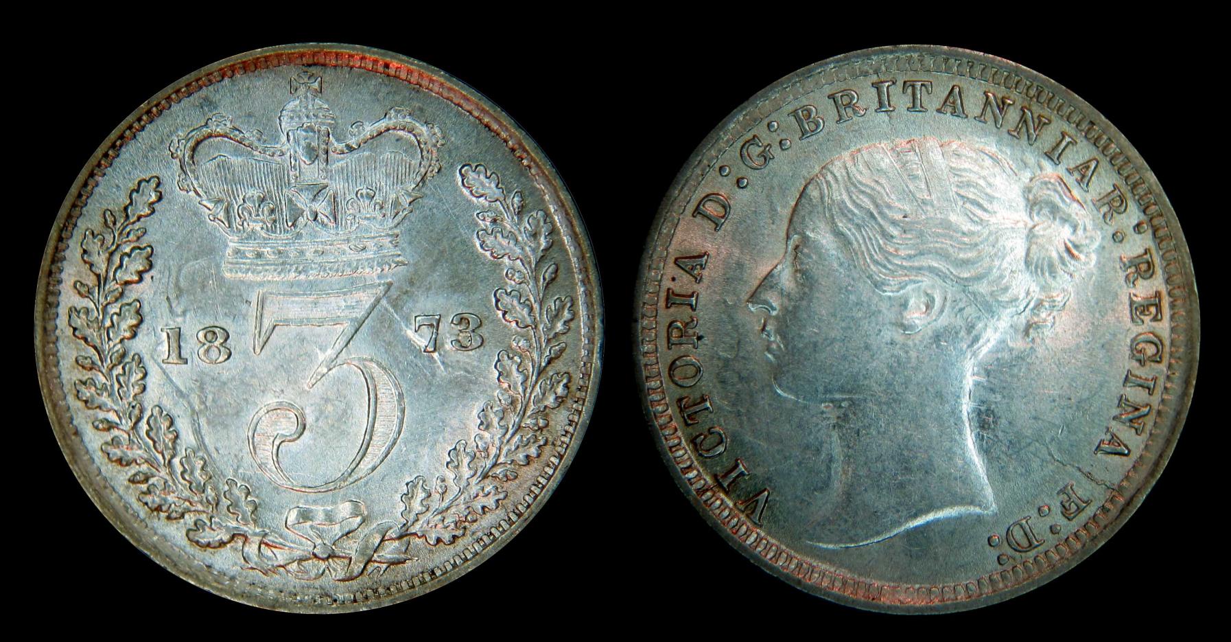 Ladies & Gentlemen, here is coin struck by clashed dies. I bought this at the Naugatuck Connecticut coin show this last weekend. You can clearly see the outline of Queen Victoria’s profile on date side of this 1873 three Pence coin. You can also see the outline of the several wreath leafs both behind & in front of Queen Victoria’s head.