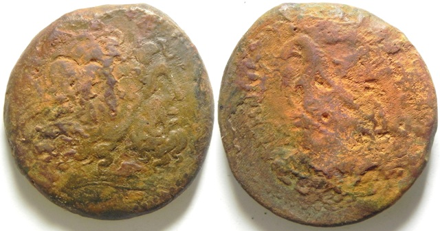 My largest bronze... Ptolemaic Kings of Egypt, Ptolemy III Euergetes Æ Oktobol (47mm, 83.04 g) Alexandreia mint. Phase 1. (246-222 BC). Obv.: Diademed head of Zeus-Ammon right. Rev.: Eagle standing left on thunderbolt; E between legs. Svoronos 446; Weiser 19-21 (Ptolemy II); SNG Copenhagen 142; Noeske 64 (Ptolemy II).