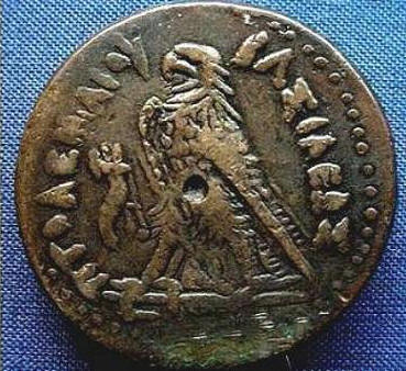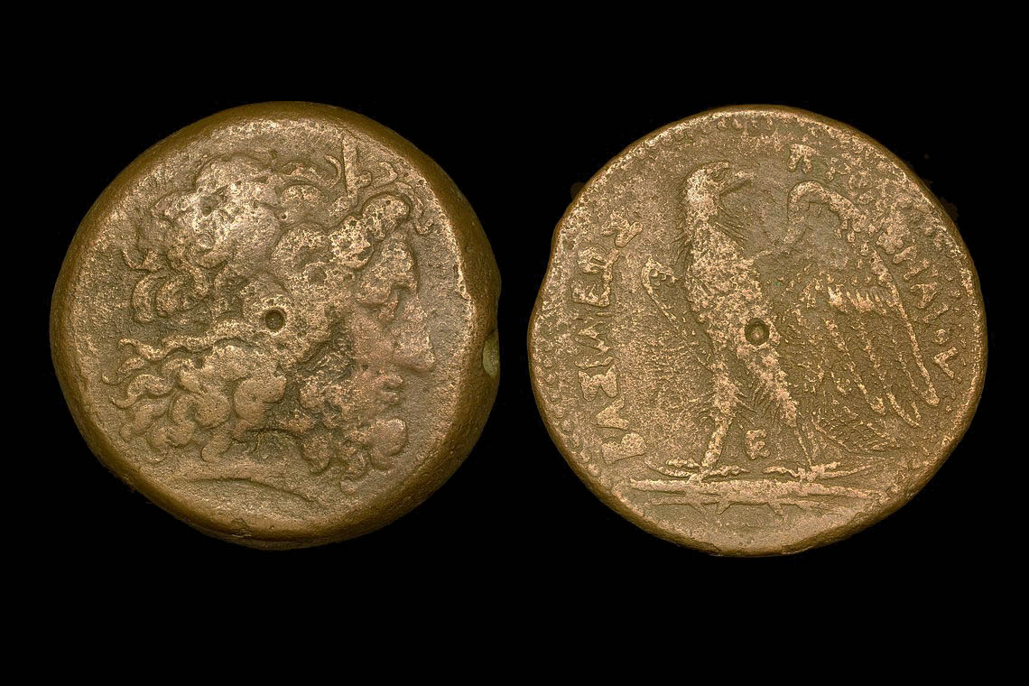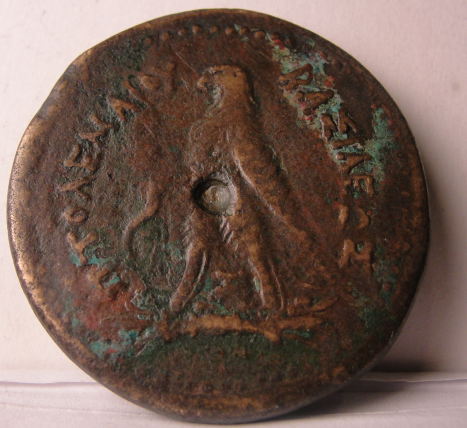 Kings of Egypt, Ptolemy IV Philopator 221-205 B.C. Diameter: 40 mm Weight: 70.32 grams Obverse: diademed Zeus-Ammon head Reverse: eagle standing left on thunderbolt, cornucopea before, monogram between legs Kings of Egypt, Ptolemy IV Philopator Alexandria Mint 212-204 B.C. Diameter: 41 mm Weight: 70.85 grams Obverse: Head of Zeus-Ammon right, wearing tainia Reverse: Eagle with closed wings standing left on thunderbolt; filleted cornucopia to left, monogram between legs