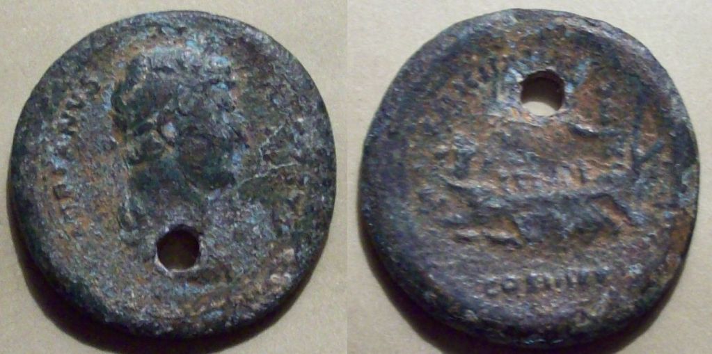 Time to make everyone else's coins look prettier... My largest coin, a Hadrian sestertius with galley reverse, 34 mm wide