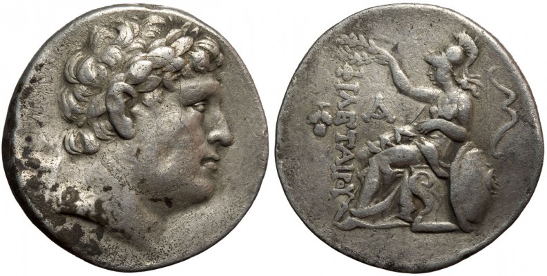 Pergamene Kingdom, Philetairos, AR tetradrachm, 282-263 B.C. Obv:– Laureate head of Philetaurus right Rev:– FILETAIPOY, Athena seated left, left elbow resting on shield set on ground behind, holding wreath in right hand above legend; grape bunch in outer left field; strung bow in right field Minted in Mysia, Pergamon, 241 - 197 B.C. Reference:– Westermark Group IV B, SNG Cop 336, SNG von Aulock 1358. Weight 16.74g. 31.69mm