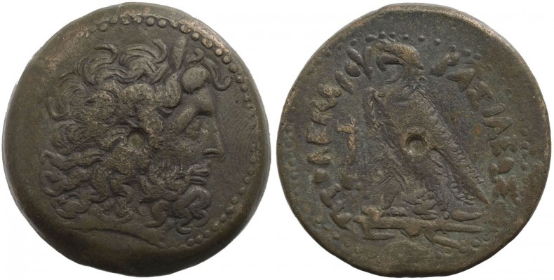 Ptolemaic Kingdom, Ptolemy III Euergetes, 246-221 B.C., AE42 Obv:– Diademed head of Zeus Ammon right Rev:- PTOLEMAIOY BASILEOS, eagle standing left, head left, on thunderbolt, wings closed, GreeK_Sigma between legs Minted in Alexandria under Ptolemy III Euergetes or Ptolemy IV Reference:- Svoronos 992 70.23g, 41.93mm, 0 degrees. Not huge but still a big lump of bronze.