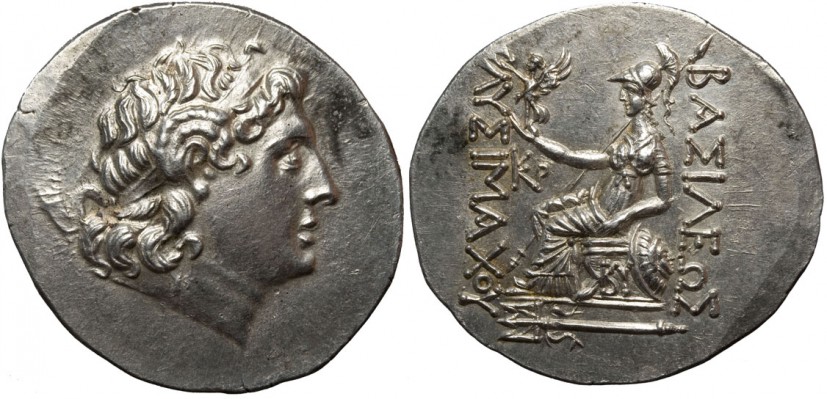 Lysimachos, Kingdom of Thrace, AR tetradrachm, Posthumous Issue, circa 2nd Century B.C. Obv:– Diademed head of the deified Alexander right, with horn of Ammon. Rev:– Athena enthroned l., holding Nike on extended r. hand and spear, and resting l. elbow on shield propped against throne; LUSIMACOU in l. field; KP monogram in inner field; BY on throne, BASILEWS in r. field; ornamented trident in exergue Minted in Byzantium, circa 2nd Century B.C. (Posthumous Issue) Weight 16.97g. Size 37.11 mm