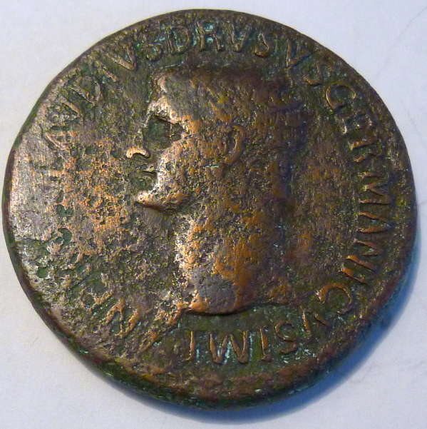 Nero Claudius Drusus Sestertius OBV: NERO CLAVDIVS DRVSVS GERMANICVS IMP - Bare head left REV: TI CLAVDIVS CAESAR AVG P M TR P IMP Exe: SC - Claudius seated left, holding branch; weapons on floor Struck at Rome, 41-42 AD 28.6g, 36mm RIC 93