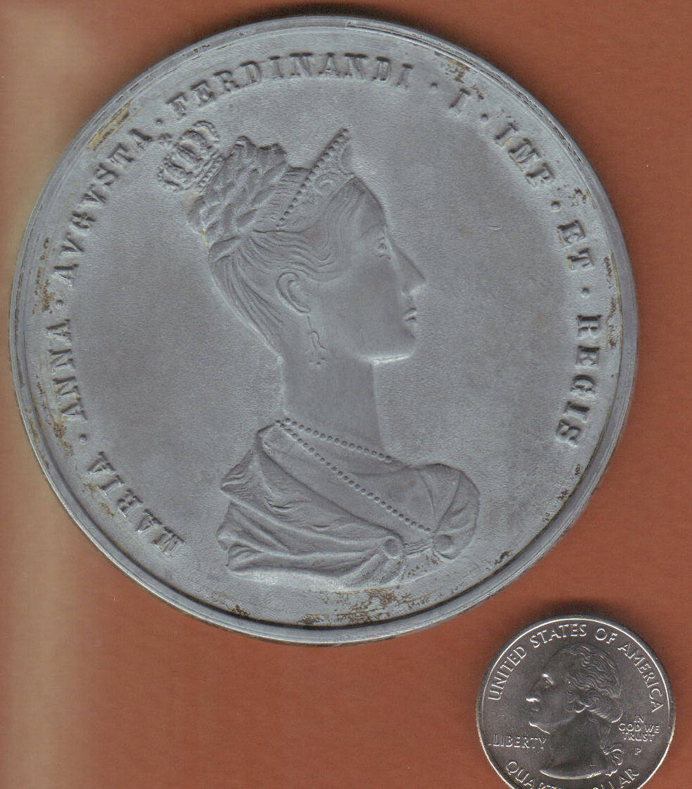 This is a very odd medal - read carefully. It is basically a coronation medal, quite large, about 75mm in diameter. It appears to be zinc, although an article I found says this design has been struck in silver, copper, and blackened copper (but not zinc). All examples appear to have a date error, with Roman numerals showing 1336 instead of 1836, and apparently there are many restrikes, varieties, and sizes over the years. There is no way to pin down the exact status of this piece, but even if it is a 20th Century restrike, I think the postpaid price is fair. This example has "traces" of blackening, especially on the edges, but it is clearly not copper. I would call it VF to XF, with no marks in the field, and only minimal wear. There is no case or display box. It is written up at: http://www.austriancoins.com/medalsassorted.html Price, $20 postpaid. PayPal or money order, no cash please. Shipped only to the U.S., all sales final. Additional information welcomed.