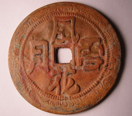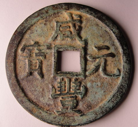 The first coin is from the Emperor Hsien-feng 1851 - 1861 with a type C obv and the reign title Hsien-feng Yuan Pao. The rev picture is upside down which is giving me some trouble with the mint name. It is either Boo-Clowan (Peking Board of Revenue) or Boo-Yon the Yun mint in Yunan Province. Well it appears they didn't issue a 1000 Cash in Yunan Province so it must be a general empire issue for Boo-Clowan and that would make it C 1-11