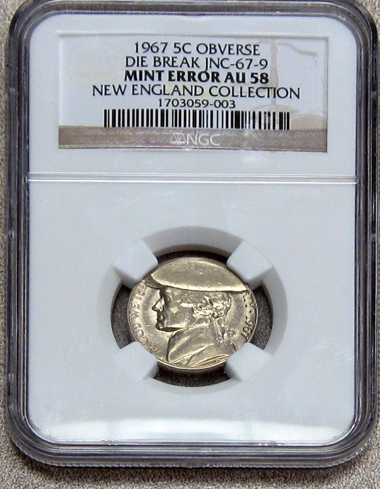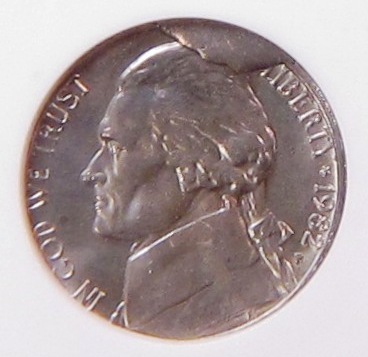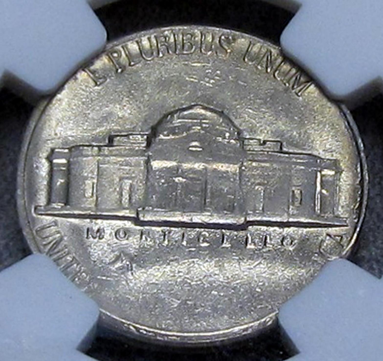 Of course, a “cud” error occurs when one or more of the dies has a piece that breaks away leaving that portion of the coin unstruck. For it to be called a “cud” the die break is suppose to affect an area out to the edge of the coin (as it does in my new coin). In this nickel, a piece of the obverse die broke & fell away. This coin received a subsequent strike and the obverse design is completely missing in the die break area. The corresponding area of the reverse design is also missing because there was no obverse die to press the planchet into the reverse die. You will note the original planchet surface evident in the un-struck areas on both the obverse & reverse.