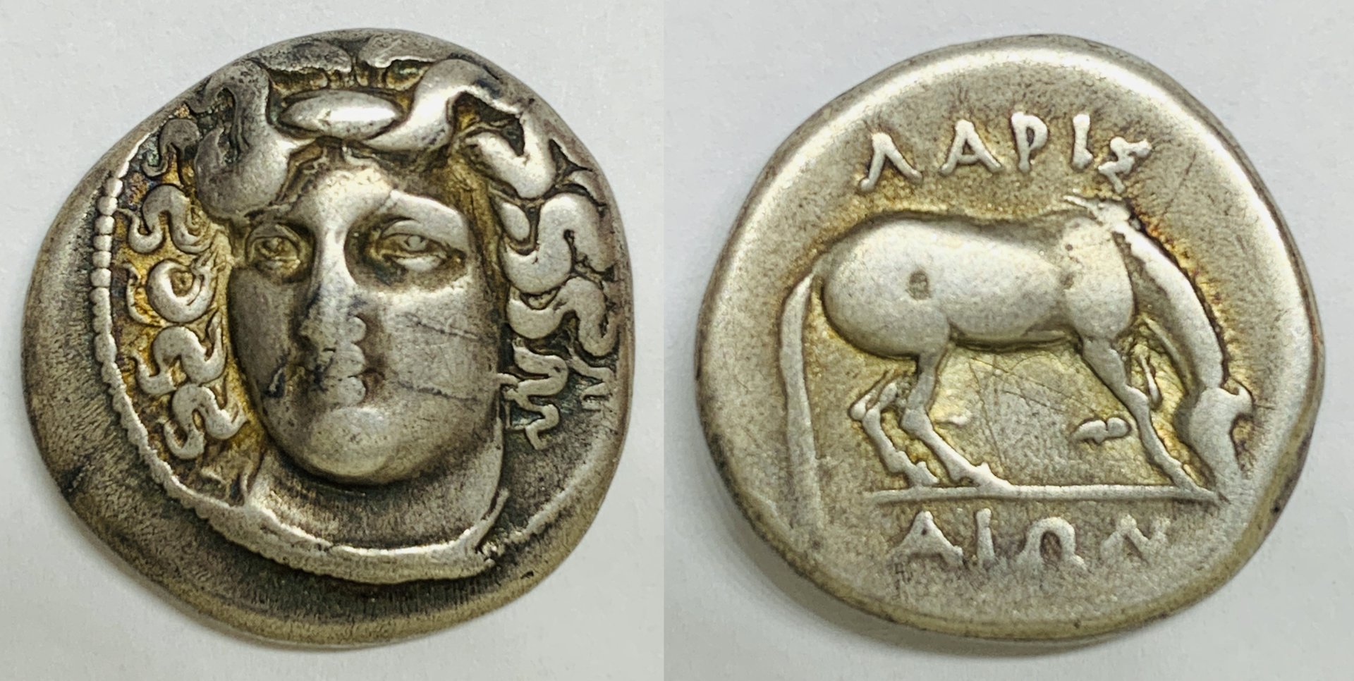 Thanks for your take on the coin. Actually I do not have it yet in hand so that will be interesting. It is a little light at 5.5 grams but I have a good feel for ancients since collecting as a boy mostly from Alex Malloy when he came to the coin show near my home town. I learned a lot from him and the guys at Stacks in the city. I will not forget that Mr.Malloy would remind me to save up my money and by better quality instead of going for the cheaper stuff. The fact is I also bought a Larissa Hemidrachm on Vcoins with a great BCD provenance and do not have that one yet either(see image of this one). As i said for the $65. I paid for the OP drachm I am alright with the gamble. I always wonder with an ancient at this cost level how much time would it take to create one especially with an obverse that has porosity or crystallization? Would it really be worth the time involved? maybe it would not have a big time investment? Not sure?(maybe if you made a hundred at a time it would be worth it?) I checked the fakes forum and there were no others like it unlike the Bulgarian fakes with many at a time flooding the market and easily recognizable. Folks here on this forum would know this end of the business better than I. Now for coins in the three digits which is my limit of cost I look for a reputable dealer and a provenance. Thessaly, Larissa 356-337 BC, Hemidrachm 2.78g Head of the nymph Larissa facing, slightly left Horse grazing right. BCD II 325 Ex BCD collection with tag