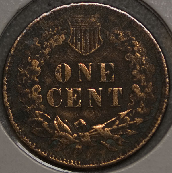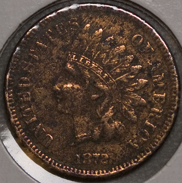 Well, after some more time with the camera and what lighting I have, I've reached the conclusion that this is one UGLY coin. But, again, 1872! This shot captures the bright specular highlights that the coin gets in direct light. Those bright (scrubbed) high points look more red than this shot indicates, but this is a pretty close approximation of what it looks like in-hand. Here's a shot in diffused light. It doesn't match the in-hand view, but it gives a clearer impression of the (ugh) surface texture, and also the remaining corrosion. Definitely a task for Verdi-Care, I think. This coin isn't much of a prize, and I'm not sure I'll be hanging on to it, but I still think I'll do better than the $12 I paid.