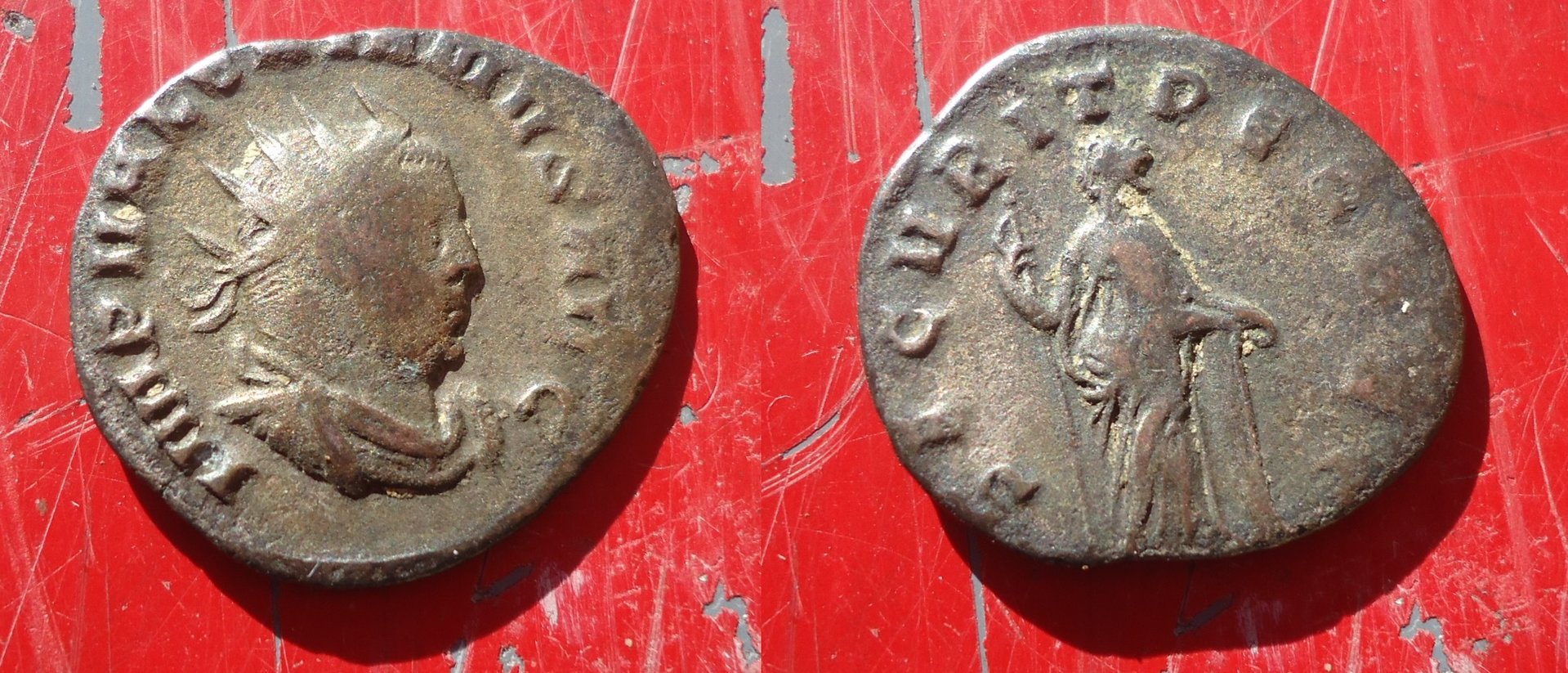 Nice one, RC. I thought I had one these, but mine lacks the column and has a less casual approach to being a goddess. I guess they ran a tighter ship out at the Milan Mint. Trebonianus Gallus Antoninianus (251-253 A.D.) Mediolanum (Milan) Mint IMP CC VIB TREB GALLVS AVG, radiate, cuirassed and draped bust right / LIBERTAS PVBLICA, Libertas standing left holding pileus and sceptre. RIC 70; Cohen 68; RCV 9636 (3.90 grams / 22 mm) I poked around and found a leaning goddess on an issue of Valerian - Securitas doing a Joe Cool - RIC 256 Cologne Mint (SECVRIT PERPET):