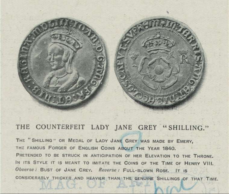 the "coin" was actually pictured in a movie about lady jane, when she was beheaded it fell from her hand.
