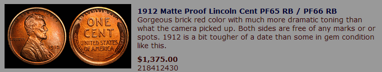 OK I took the plunge and bought this. The price was $1,375. There's a full 7-day money back return policy, so at least I get to examine the coin in hand before deciding if it's a keeper. I think I will drive it up to my local coin dealer and have them look it over when I get it in the mail (they've been in the business for 40 years and I trust them). I know this is a bit of a risk, but honestly I thought the coin looked really nice (very clean) and I loved the brick red-brown color. I actually thought it looked TOO GOOD, which is why I thought it might be artificially toned. If it is re-toned, whoever did it did a nice job. If it comes back from PCGS as "Genuine, Not Gradable", I probably have maybe $700 of potential downside. But could have some good upside if PCGS grades it. This was the original ad for the coin: I am hoping for a grade of PF65RB with this (I think it has a shot), but have to keep the possibility of a Genuine details grade in mind. I asked the seller why it wasnt graded, and this is what the seller said: "Thanks for your interest in my coins, and for asking all of these questions in advance. To help make sure I address every one of them, I'll answer them in order. I haven't sent this coin in for grading just because I don't feel like dealing with the headache. Every time I send a group of Lincolns in, it seems like I put out $300 and only a few of the coins grade out correctly. Then I have to send the rest back in again with another group to see PCGS grade them differently a second time around, still with at least half of the group having ridiculous results that often contradict the first opinion and make no sense to me. So a few years ago I just said the heck with it and decided to focus on mostly raw coins. I figure I can sell them for less than certified coins and let someone deal with getting them graded. One reason matte proof collectors like to buy them certified is because they want to make sure they are getting a matte proof and not a $50-$100 business strike. Many people cannot tell the difference themselves, and like to have the guarantee from a grading service. I happen to be one of the few dealers out there who actually use the microscopic diagnostics to identify matte proofs, rather than simply making the claim that "it must be one." These diagnostics--small areas of die polish and other mint-made imperfections--identify the proof dies and are definite evidence of a matte proof. These are the same diagnostics the people hired by grading services are taught to look for, and anyone can see them with proper magnification and lighting. If you bought the coin and submitted it to PCGS or any other grading service and it came back as a genuine matte proof, you are correct that it would not be returnable based on the grade or lack of a grade not meeting your expectations. I have no way of predicting or guaranteeing what PCGS will grade a given coin on a given day, and chances are it will grade 3 different ways if submitted 3 different times. I sell mostly raw coins. I usually have a slabbed coin or two in the mix. These are coins I received slabbed, since I don't deal with that process myself anymore. I have had this coin for about a year. I actually bought it from a gentleman from whom I bought one other 1912 matte proof. He was selling off coins that had been collected back in the 1940's and 1950's. The other 1912 was a rainbow toned one that ended up grading out as MS63 RB for my customer. It had a few spots and a large grainy area on the coin, and actually graded out about right. That shouldn't make for any guarantee that this one will also, but it should be nice to know. I'll also let you know that I personally think this coin is original. If I did not, I'd gladly mention it, as I did for the other 1912 MPL I have up for sale on my website. I don't like the idea of overgrading or hiding problems I am aware of. I want to have happy customers who come back and refer their friends, rather than trying to make a little more from one time sales. " This stuff sure makes for an interesting drama! Thanks for all the feedback from coinguy and lkeigwin on this. I will let you all know what happens. Hopefully after all the false starts, this will be my first MPL.