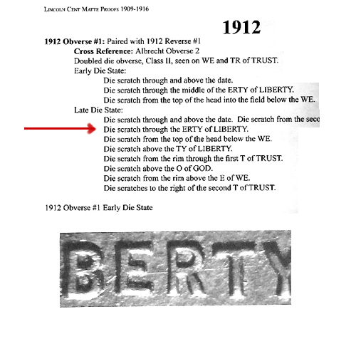 So it appears the 1912 MPL I have on 7 day approval is a genuine Matte Proof. I got the book "Lincoln Cent Matte Proofs" by Kevin Flynn and he has photos of all the die dianostics for each date. Here is an excerpt for the diagnostics for the 1912 MPL. Note the listed item about the die scratch through the ERTY in LIBERTY and the photo: And here is a magnified photo of the coin I bought: Same die scratch, same position. So at minimum this is a genuine MPL.