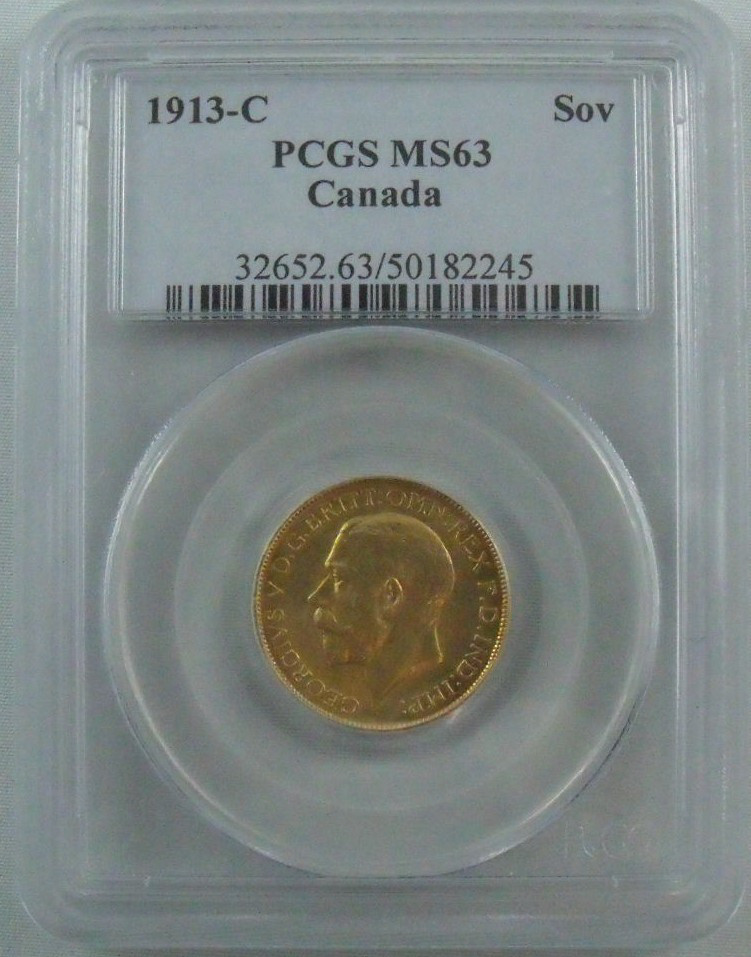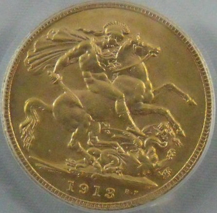 Well I just got my second 1913-C sovereign, MS63 PCGS, I sold the first one a few weeks back. This is such a rare coin, I never dreamed I would have one, much less two! Mintage was 3,717 pieces, according to Michael A. Marsh in The Gold Sovereign. Only a handful appear at auction every year. I think I'm just gonna put this one back for a rainy day ... if this were a U.S. coin it would be ten times the price. The sovereigns were introduced to replace the guinea in 1820, and seven different mints made them, in the days when the "sun never set on the British Empire" -- London, Perth, Melbourne, Syndey, Pretoria, Bombay, and Ottawa. (If I have any of this wrong I hope my British friends will correct me.) So ... post your gold sovereigns, everybody! 1913-C Sovereign MS63 PCGS