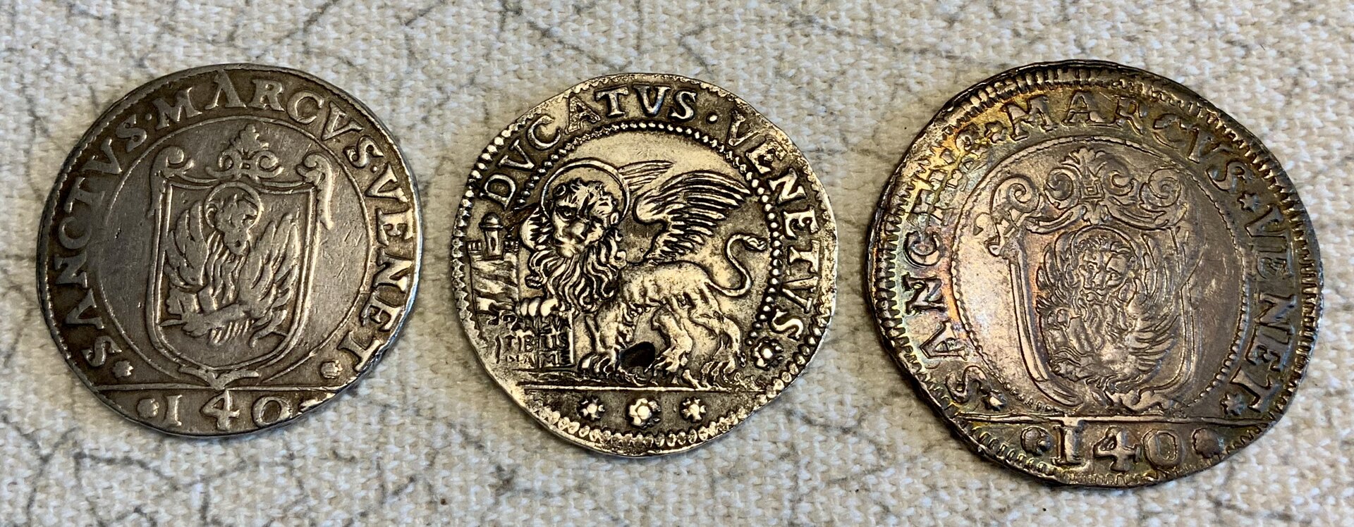 A few more Doges (it is going to be hard to avoid Doge-repetition.) #1 is a scudo or 140 soldi of Nicolaus de Ponte, of 1584. A.M. in the exergue. Nicolò da Ponte was Doge from 1578-85 AD. He was elected at age 87 and died aged 94. The obverse shows the winged lion of St. Mark Venetorum, of the Venetians. Mass is 31.2 grams. Purchased 9/12 #2 is a silver Ducato of Silvestro Valier, Doge from 1694 to 1700 AD. He was the 109th Doge. Unlike his predecessor Francesco Morosini, he was not much of a military leader. The Great Turkish War concluded during his reign with an allied victory bringing Venice the Morea, Aegina, Lefkada, and Zakinthos. But Venice was exhausted financially and by loss of life. Mass is 22.37 grams. Small planchet flaw between the lion’s legs. Purchased 11/11 at the Boston coin show from Renaissance Coin Co. (James Diracles) #3 is a Scudo of Francesco Loredano Doge from 1752- 1762 AD. His neutrality during the Seven Years’ War allowed Venice to trade with all sides and brought prosperity. Gorgeous toning. Purchased from Del Parker at the Boston coin show in 5/1998. Mass is 31.1 grams.
