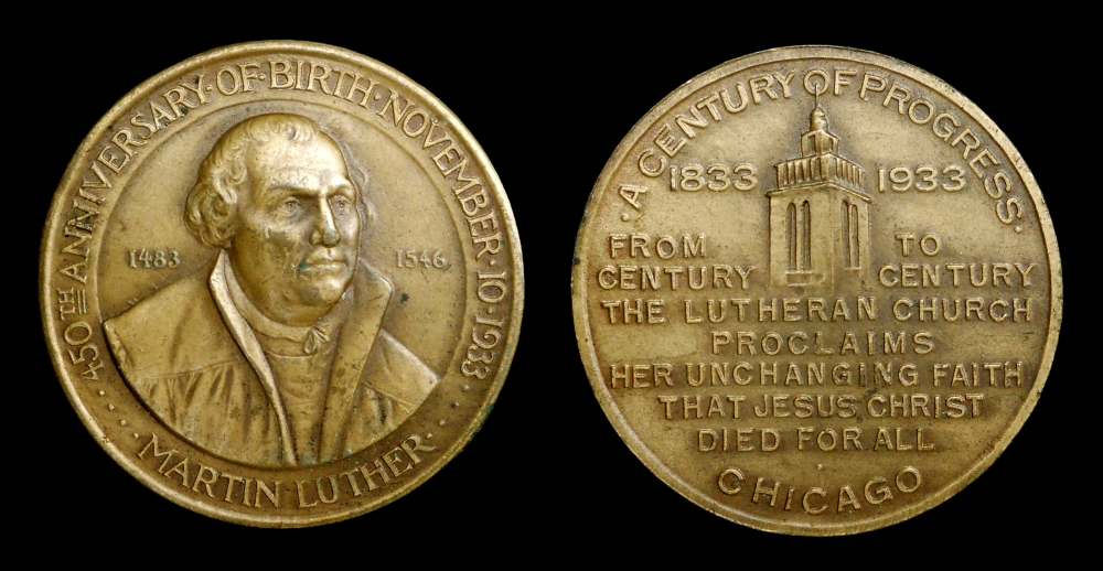 This really is one of the most interesting threads on CT. Thank you to everyone for sharing their acquisitions. I recently came across this medal for a dollar in a junk box, from the Chicago World's Fair, 1933. The high points of the bust are obviously abraded, from being tossed around with other coins, but such is the stuff that junk box collectors collect. I can't fix that, but the piece is somewhat gunky, and it's going into an acetone bath today. I'll post "after" pics if there's any improvement. Obverse: 450th Anniversary of Birth. November 10, 1483. Martin Luther. Reverse: A Century of Progress. 1833-1933. From Century to Century the Lutheran Church Proclaims her unchanging faith that Jesus Christ died for all. Chicago (World’s Fair). Composition: Brass; Weight 19.0 gr; Height 21.42 mm; Width 21.38 mm.