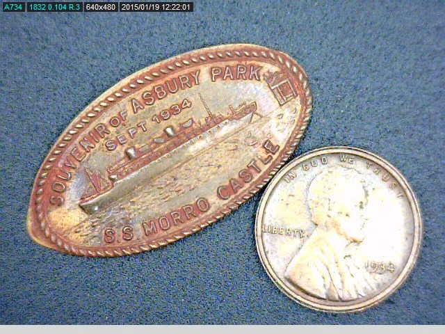 Greeting from Asbury Park NJ. it's 1934 and remember the S.S. Morro Castle. an encased 1934 Lincoln and it's brother a squished cent.The September Fire