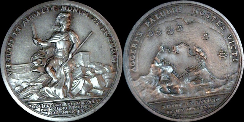 This is one of my favorites from the series......... Major Henry Lee is depicted on the fifth medal of the series Americas First Medals originally commissioned by the Continental Congress. Major Lee commanded light cavalry and was at the battle for Stony Point under the direction of General Washington to do reconnaissance work and assess the British defenses there. After storming the British positions and upon the achievement of victory by the colonials, Major Lee asked Washington if he could undertake a similar operation at Paulus Hook, now present day Jersey City, NJ. General Washington agreed , but limited Lee to a force of 200 men and made clear to Lee that the main purpose of the operation was to surprise the garrison, take prisoners and to in no way attempt to hold the fort. Just before daybreak on August 19, 1779, Lee's forces stealthily advanced and without firing a shot, cleared the abatis, crossed the ditch around the fort and entered the works. Lee and his men handily captured 158 prisoners and further intended to burn the barracks before embarking on their retreat, but the presence of wounded soldiers and women & children within the confines prevented Lee from doing so. Having achieved their objective, Lee and his men retreated back to Hackensack arriving there safely but were constantly harried by a British force along the way. The original medal was struck in gold and bears the distinction of being the only medal in this series to be designed by an American, Joseph Wright (1st engraver of the US Mint). The obverse (in Latin) reads: "The American Congress to Henry Lee, major of cavalry." The reverse, inscribed in Latin, reads: "Notwithstanding rivers and ramparts, he conquered, with a handful of men, the enemy by skill and valor, and attached by his humanity those vanquished by his arms. In commemoration of the Battle of Paulus Hook, August 19, 1779."