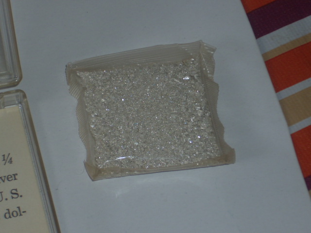 Here is a style of Exonumia,In my opinion at least.I have been in contact with the Senior Editor at a popular Numimastics magazine about their history and his was somewhat stumped.It is obvious of what it is it is the "history" of the package meaning there has been many fake's on e#@y mostly geniric vials&labels and with pellets...This as you can see( ? )are crystal like,flake's.He had said that HE has never seen one packaged like this.Has ANYbody have or seen one of these? I know it's right as rain but...:wacky: it's driving me whacky!!! I bought 2 when a local coin dealer my dad use to take me to that was selling out,I should have bought all he had! Said he got some himself&others came in during the HUNT brothers scam,Thank's for listening!