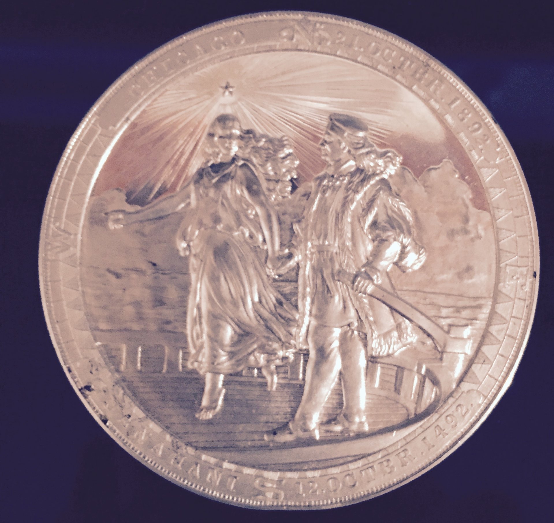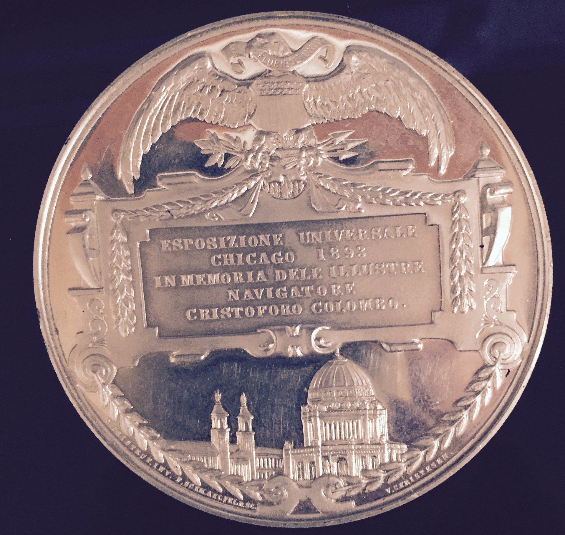 This I bought from a coin dealer in Copenhagen who had a few medals. It is about 3 inches in diameter, and except for a rim ding or two, seems in exceptional shape (the fields are mirrored). I bought it (about $25) because I figure you can't go wrong with the Columbian Exposition. It looks better than it photographs, I have trouble photographing shiny objects.