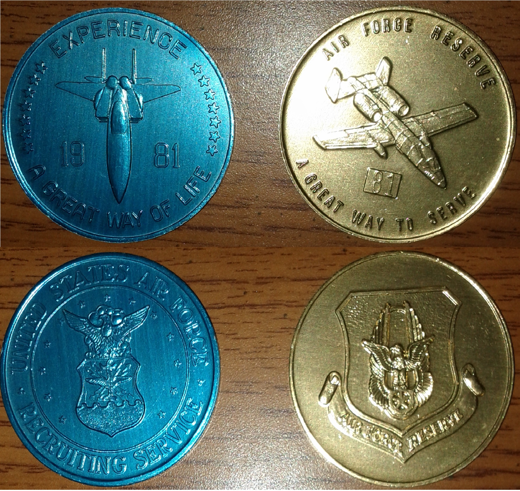 Ok, I've had these a couple weeks now but haven't gotten around to posting them. Today's the day! These coins are Air Force recruiting tokens, dated 1981 and appear to be made out of aluminum. Thought they were neat and if I remember correctly they were about $3 each.