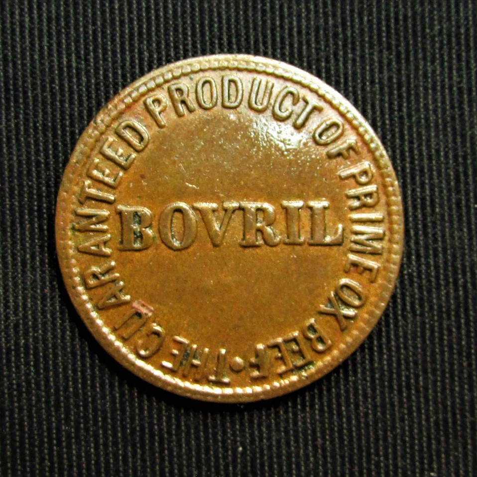 My next installment for your token and culinary enjoyment is this fine British token for Bovril. Bovril - 50 Times More Nourishing Than Meat Extract How can one resist? The finest in bronze, advertising the finest in ox squeezings. Known affectionately as "liquid cow" Bovril can be enjoyed as a spread, or mixed with swamp water for the finest in bovine tea. This thick and salty meat extract paste has been a staple of the British Empire since the 1870's and is still available at fine stock yard feed stores today . . . . . Get'yerself a jar . . . . Z https://foodanddrink.scotsman.com/drink/10-things-you-probably-didnt-know-about-bovril/ https://www.unilever.co.uk/brands/food-and-drink/bovril.html