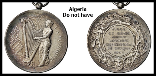 1907 Concours International De Musique Paris by Felix Rasumny This is a rather large medal, it was described as silver composition, but I was suspecting it is silvered bronze long before the auction ended. There is not a lot of information on the history of Concours International de Musique that I can find, but I believe it translates to International Music Competition. I have read that traditionally in Paris, to start off the summer, there is a festival of music throughout the streets and in various venues. I do believe that this event has occurred for many years without interruption. Today there are still competitions of singing and playing of instruments. I have found earlier medals, and one that is almost exactly like this only almost a centimeter smaller and for Algeria dated 1902. I have found stamps and postcards on the topic but I know little about them too. I did know I especially liked the obverse and it was a must have for me.