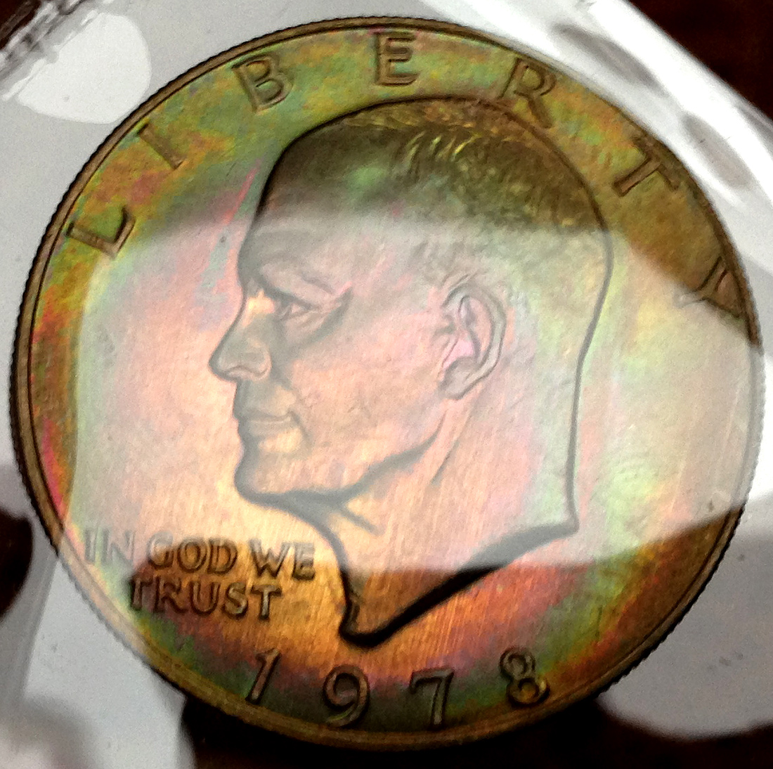 I bought this raw Ike on eBay a few days ago and I just got it in today's mail. It's very colorful with unusually smooth toning for a Copper Nickel Mint State Ike. In a few days, it's off to robec for some professional photos, then off to PCGS for grading. These large coins are kind of cool, and I wish the mint still made them and they circulated. Having some big dollar coins in your pocket makes you feel kind of rich, even if you only have a few bucks.