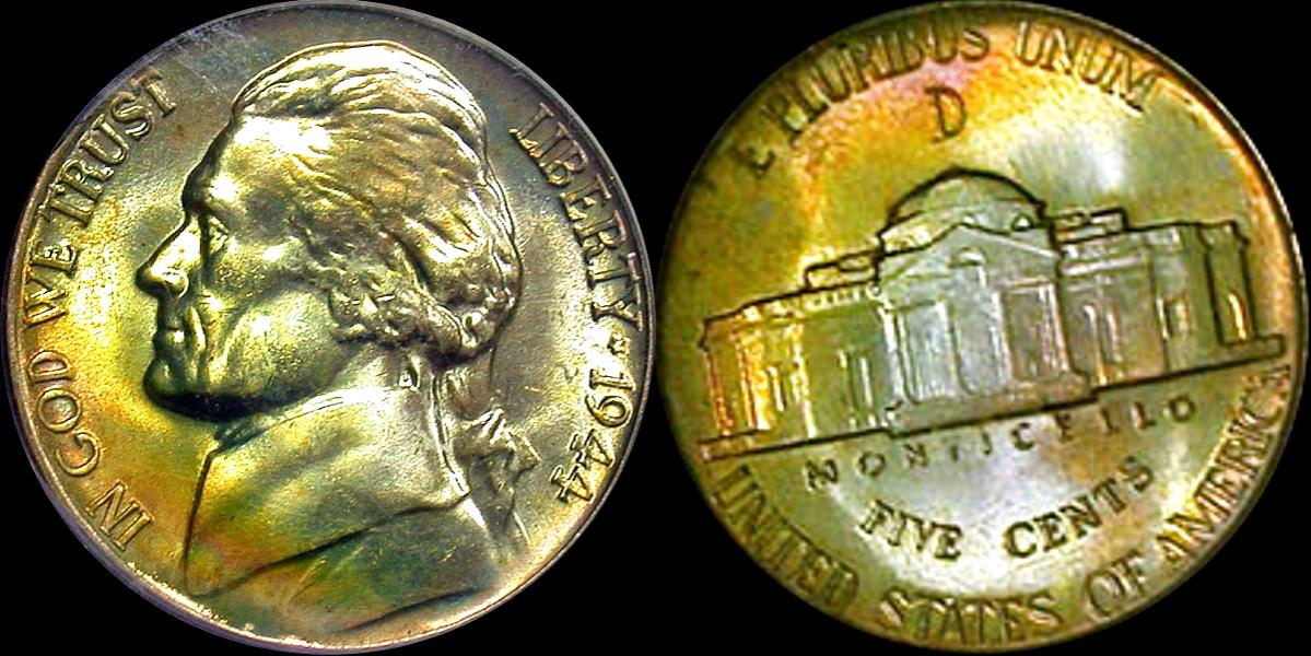 This is the more typical silver toning pattern (with the hard distinct border) that you see ... (this is not my coin! image by robec). Robec has some that are all silver colored (both sides).