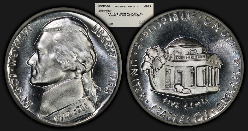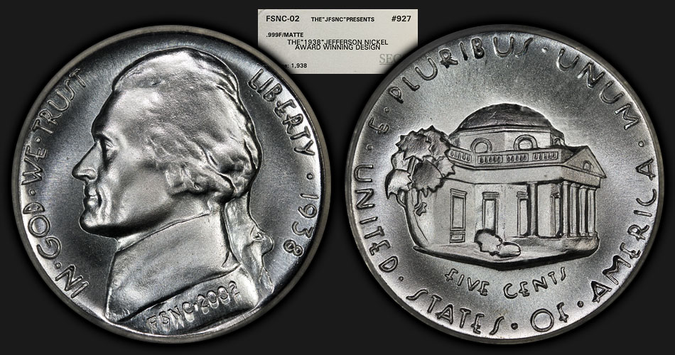 They are "fantasy" pieces issued by the Full Step Nickel Club in 2002 to commemorate the original design submitted by Felix Schlag for the Jefferson Nickel. The original reverse design was not liked, and so Schlag (with the suggestions of the committee who reviewed the design) provided at least one additional design which was accepted as the Jefferson Nickel reverse that we all know well today. The dies for these pieces were prepared by Ron Landis of the Gallery Mint. He is a brilliant artist, and is especially well known for his amazing Hobo Nickel art. The fantasy pieces were issued in two finishes, MATTE and PROOF, as described on the labels -- and each finish was struck in a mintage of only 1,938 (to commemorate the original year of issue of the first Jefferson Nickel). They were originally issued for $38 for the MATTE piece and $42 for the PROOF piece (including shipping) -- $80 for the pair. All pieces were individually numbered and encapsulated by SEGS. You will note that my pair I posted is serial number #927. You can ind a lot more detail at this link.