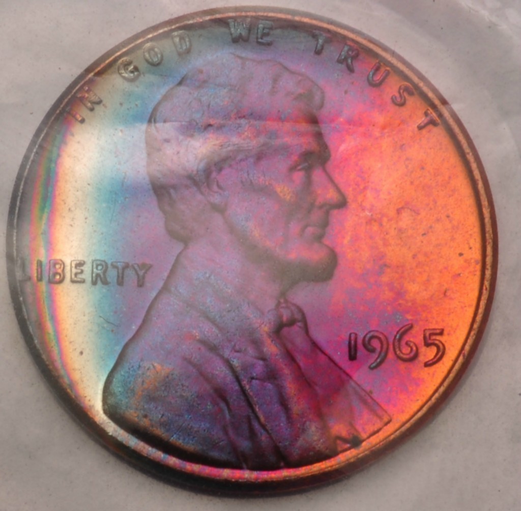 Just picked this off the internet...a monster toned 1965 SMS Lincoln Cent (still in cello). While the reverse is relatively red, the obverse sports deep blue and purple shades, along with a razor thin rainbow showing along the rim. The only downside is the carbon spots that are relatively obvious on the reverse. While monster lincoln proofs were known to exist during the early '60s (60-64), the amount of toners abruptly drop off in the SMS years.