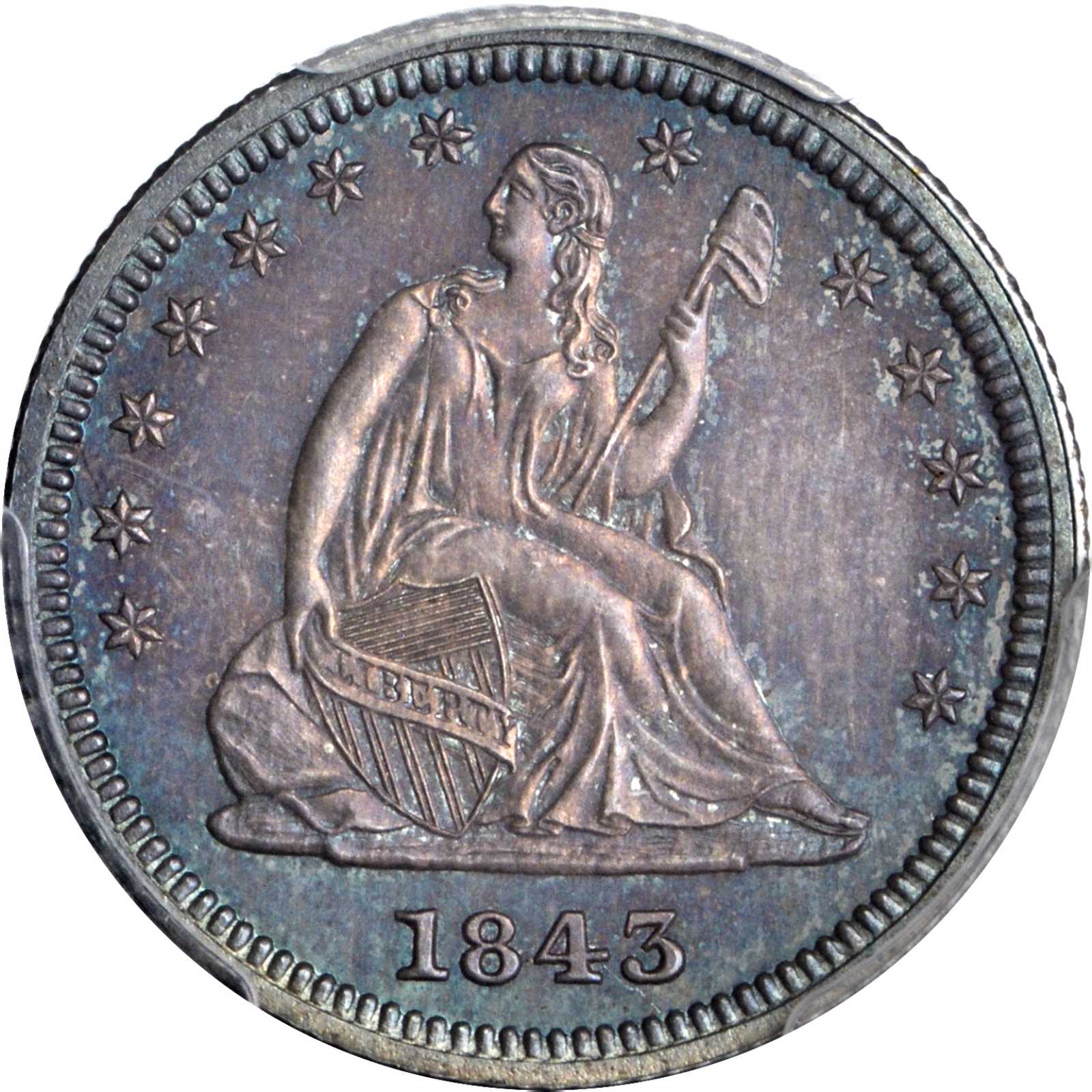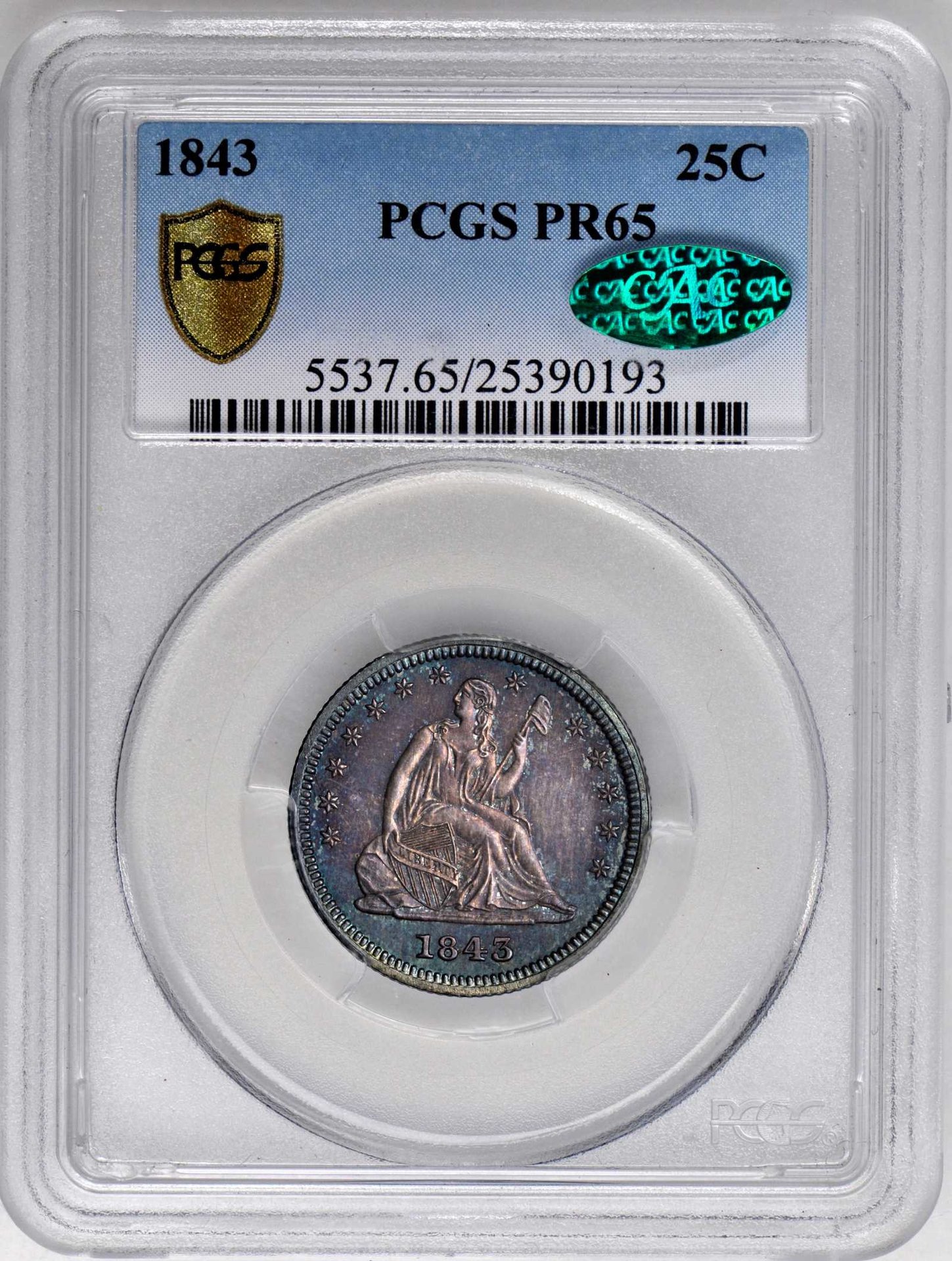 Brought to you by Stacks Bowers a company We can all trust. I've had a blast today and have a few New'p s to share with you guys. This 1843 Liberty Seated Coin is one of only 7 Specimen Proofs and this PCGS PR 65 is the finest, with CAC in agreement. 1843 Liberty Seated Quarter. Briggs 4-E. Proof-65 (PCGS). CAC. Secure Holder. This important early Proof quarter combines outstanding technical quality with undeniable rarity. It is aesthetically pleasing, as well, with both sides richly toned in mauve-gray 1 - PCGS Proof-65 (formerly NGC Proof-66). Ex Numismatic Gallery's ANA Sale of August 1946, lot 442; David W. Akers' sale of the John Jay Pittman Collection, Part II, May 1998, lot 1309; Heritage's sale of the Phil Kaufman Collection of Early Proof Sets, August 2008, lot 1808; Heritage's CSNS U.S. Coin Signature Auction of April 2013, lot 4218. The present example, and certainly the finest known Proof 1843 quarter.