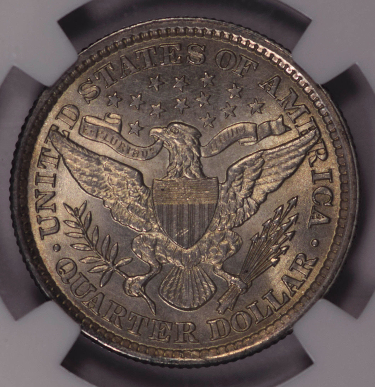 Just got this one in hand today. These are seller pics but they convey the character of the coin well. I really like the blue toning around the obverse rim. This is replacing my previous Barber 25C type coin since the look matches up very nicely with my 1876 seated 25C and 1835 B-6 bust 25C.