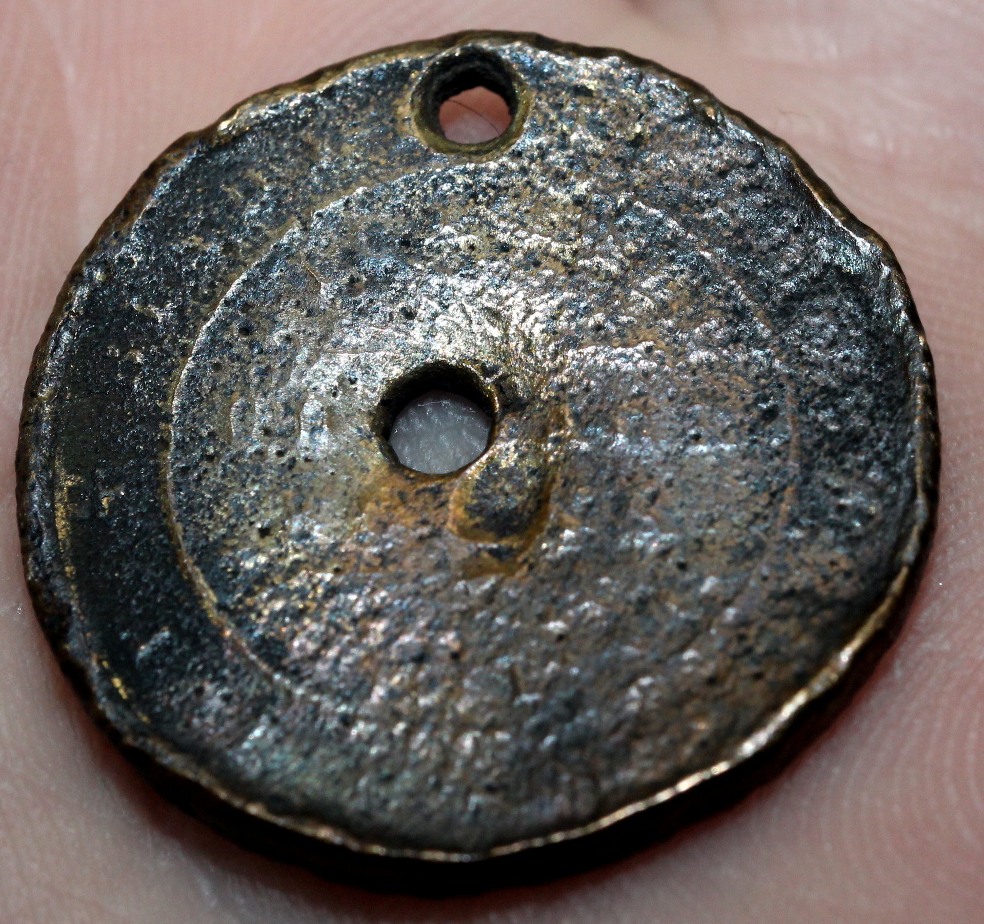 I'd be willing to bet the piece was not struck with either hole, the main hole is off-center, and that just doesn't happen, and the edge hole obviously roughly drilled.