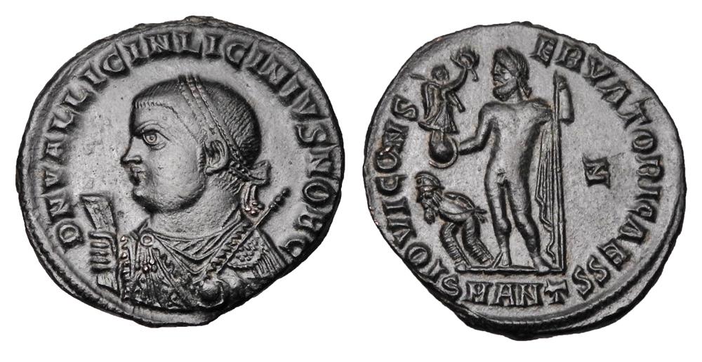 Some great coins out there. Father : Licinius I, Follis Alexandria mint, 3rd officina, c. AD 308-310 IMP C VAL LIC LICINIVS P F AVG, laureate head right GENIO IMPE - RATORIS, Genius standing facing, head left wearing modius, Chlamys over left shoulder, holding cornucopia and patera. ALE at exergue, K | P in lower field, Γ in right field 9.02 gr 24/26 mm Ref : RIC VI # 101b, RCV # 15179 (65), Cohen # 43 Ex Voz collection of Roman imperial Licinius I, reduced follis Alexandria mint, 7th officina IMP C VAL LICIN LICINIVS P F AVG, laureate head right IOVI CONSER - VATORI AVGG, Jupiter standing left, holding Victory on globe in right hand and sceptre in left hand. An eagle holding wreath in his beak at his feet in left field, In right field a wreath above a Z above an N, at exergue ALE 4.23 gr, 20/21mm Ref : RIC # 10, RCV # 15246, C # 108 and son : Licinius II, AE3 Nicomedia mint, 4th officina, AD 317-318 D N VAL LICIN LICINIVS NOB C, draped and diademed bust right PROVIDENTIA CAESS, Jupiter standing left, holding victory and sceptre, palm at his feet, dot and Δ in right field. SMN at exergue 3.19 gr Ref : RCV # 115419 (75) Cohen # 39, RIC VII # 33-34 Q