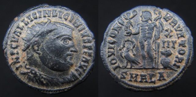 It is time to dig out my Licinius coins Roman Imperial: Licinius I (308-324) BI Reduced Follis, Siscia (RIC VII-8) Obv: IMP LIC LICINIVS PF AVG; Laureate head of Licinius right Rev: IOVI CON-SERVATORI; Jupiter standing left, holding Victory of globe, leaning on scepter, eagle at feet, ϵ in field to right; SIS in exergue Roman Imperial: Licinius I (308-324) Æ Follis, Nicomedia (RIC VI-69a, SR-15215) Obv: IMP LIC LICINIVS PF AVG; Laureate head of Licinius right Rev: IOVI CONS-ERVATORI; Jupiter standing left, holding Victory of globe, leaning on scepter, eagle at feet, Γ in field to right; SMN in exergue Roman Imperial: Licinius I (308-324) Æ follis, Cyzicus (RIC VII-9) Obv: IMP LICI-NIVS AVG; laureate and cuirassed bust left, holding mappa and scepter. Rev: IOVI CONS-ERVATORI AVCC; Jupiter standing facing, head left, holding Victory on globe and sceptre; in left field, wreath; in right field, E; SMK in exergue.