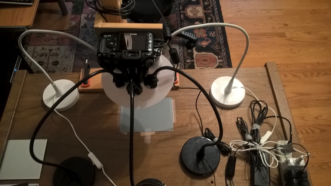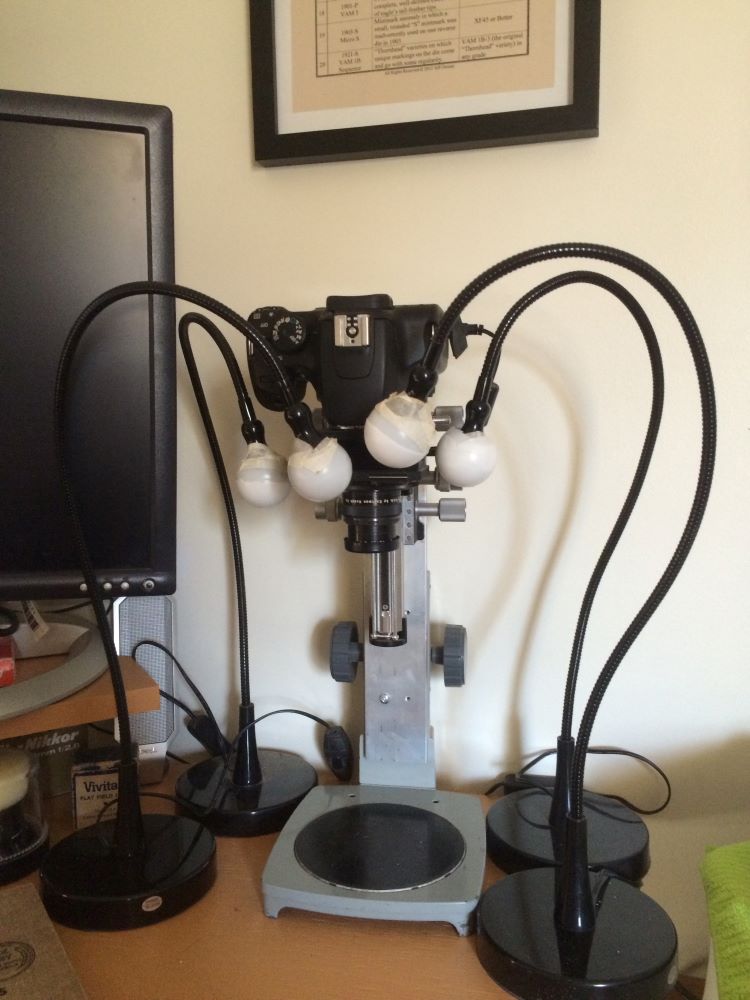 Perhaps try using those Ikea Jansjo lights? Here are a few set-ups I've tried that I saw over at coincommunity: and You don't need that adjustable camera "copy stand" thing, but you DO need a way to keep your camera/phone steady when shooting images...