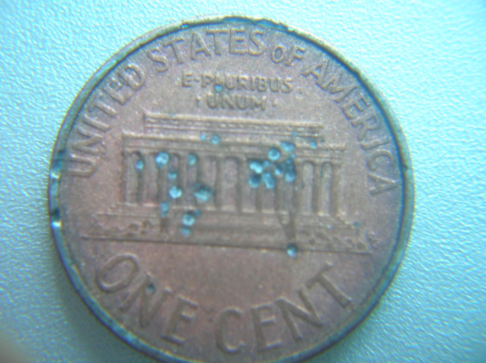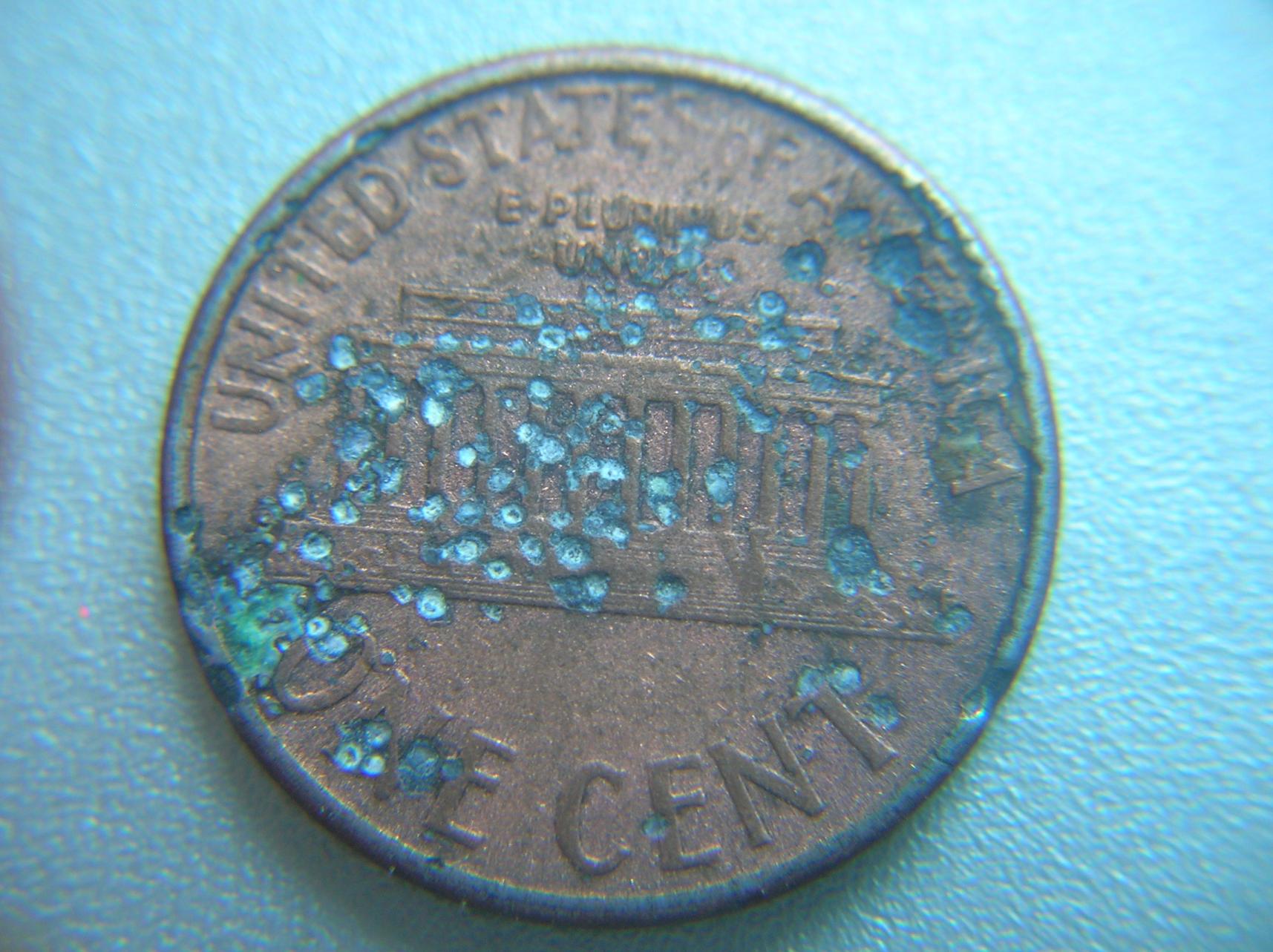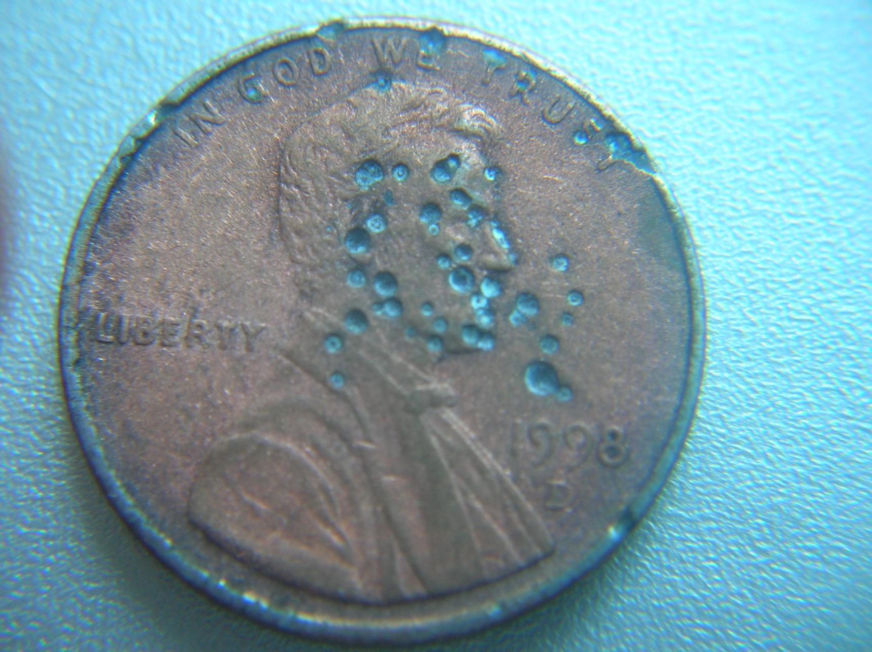 I have found another penny with this pmd, anyone have a clue as to what caused this? It looks like sandstone, and an attack on the white house by a miniture machine gun. I do know that the shots are infamous zinc blisters but the sandstone look? Thanks !