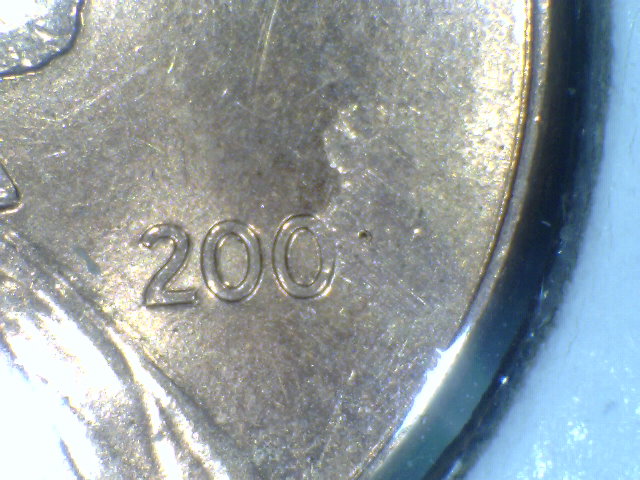 Ah! You guys don't know what you're talking about! The Mint struck 2 billion of these in 200AD. Really, it looks like a grease-filled die to me, and the "stain-like shape" is probably the periphery of a very thin layer of grease strikethrough. If you look closely, it appears to be slightly recessed at the top-left. Chris