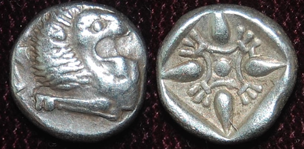 Mysia Kyzikos AR Hemiobol 480-450 BCE 0.4g Boar-Lion Sear 3850.JPG