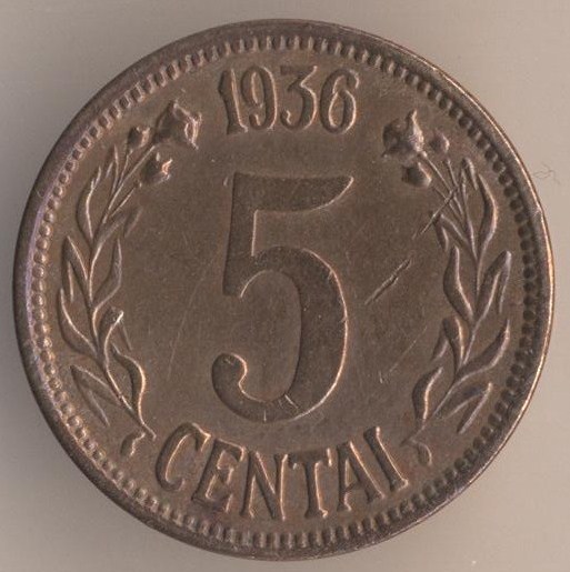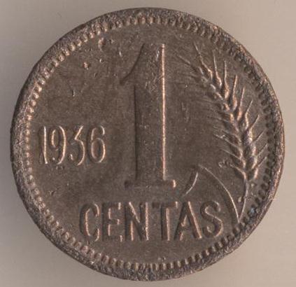 1 centas 1936, bronze, weight - 2 g., size - 16,6 mm, thickness - 1,3 mm, mintage - 9995000 pcs. The single release only. 5 centai 1936, bronze, weight - 2,5 g., size - 20 mm, thickness - 1,35 mm, mintage - 4800000 pcs. The single release only.