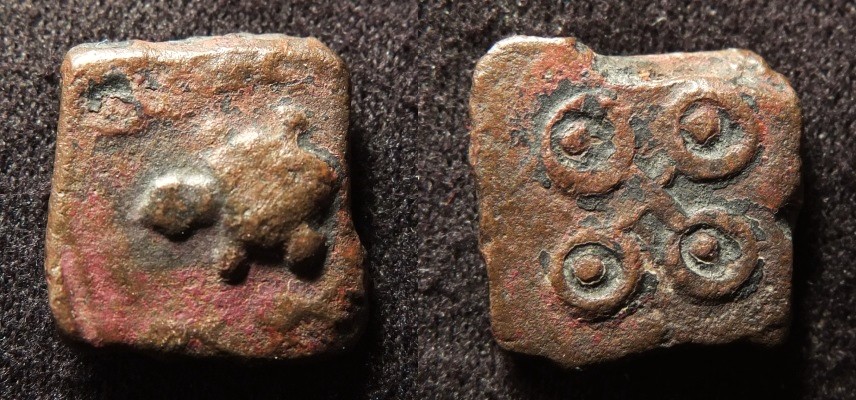 Turtle from the Indian subcontinent: Ujjain, ca 200BC, Obv: Turtle surrounded by fishes. Rev: Ujjain symbol. 8x9 mm, 0.77 gr, ref: Pieper 377.