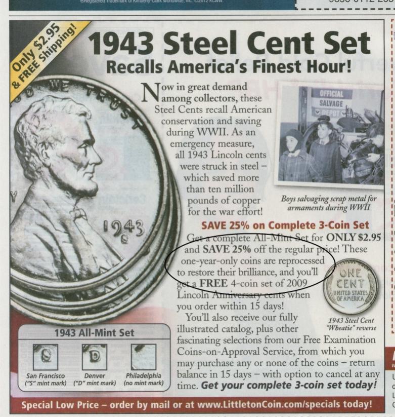 Except they enroll you in that auto send coin program if you took them up on this offer, which I've read is a pain to cancel out of. There's also a difference between a steel cent even a cleaned one vs a reprocessed one. Here's some of my personal steel cents and some 'reprocessed' ones that I took the photo from Ebay. It's really easy to see the difference in ones that have been re-plated or reprocessed, whatever you want to call it. I don't condone what Littleton is doing but they are a business and the goal is to make money. The reprocessed steel cents do make nice gift coins to give to children though as they like them shiny and the coins are basically worthless anyway. I didn't feel like digging through my coins to find some that have circulated/corroded but without reprocessing the coins are usually in horrible shape and reprocessing almost gives them a second life. If that second life inspires a kid to start collecting that's a good thing in my opinion. But I've seen some places online selling reprocessed ones for quite a bit which I don't particularly agree with myself.