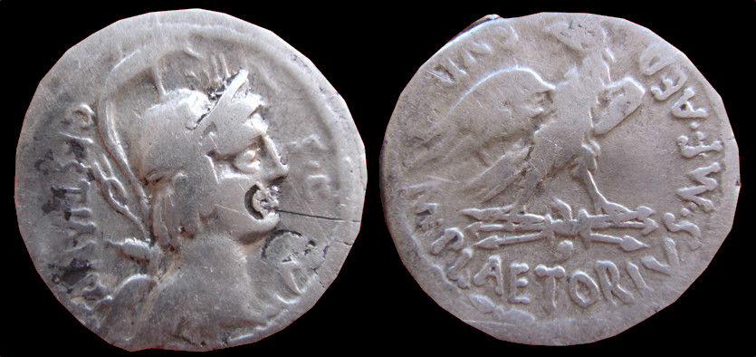 M. PLAETORIUS M.F. CESTIANUS ROMAN REPUBLIC; GENS PLAETORIA AR Denarius OBVERSE: Bust of an Vacuna right, wearing a wreathed and crested helmet, bow and quiver on shoulder, cornucopiae below chin REVERSE: M PLAETORIVS M F AED CVR Eagle right, on thunderbolt, head left Rome 67 BC 3.7g, 18 mm Cr409/1; Syd 809; Plaetoria 4